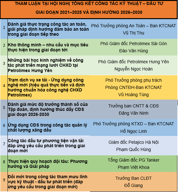 Hội nghị cũng cung cấp những góc nhìn đa chiều và chuyên sâu về từng nội dung trọng tâm trong lĩnh vực kỹ thuật – đầu tư thông qua chương trình tham luận. Với 09 tham luận chất lượng đến từ các Ban chuyên môn của Tập đoàn và các đơn vị thành viên, nhiều ý kiến, giải pháp cùng các đánh giá thực tiễn tại từng bộ phận, đơn vị đã được lãnh đạo lắng nghe, tiếp thu và ghi nhận kịp thời. Đáng chú ý, đây là lần đầu tiên việc ứng dụng trí tuệ nhân tạo (AI) được tích hợp vào các phần trình bày tham luận, góp phần nâng cao hiệu quả trực quan, tạo dấu ấn ấn tượng và thể hiện rõ xu hướng đẩy mạnh chuyển đổi số trong Petrolimex.